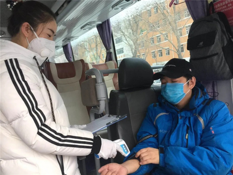 青年志愿服务队队员在公司通勤车上为乘车人员测量体温