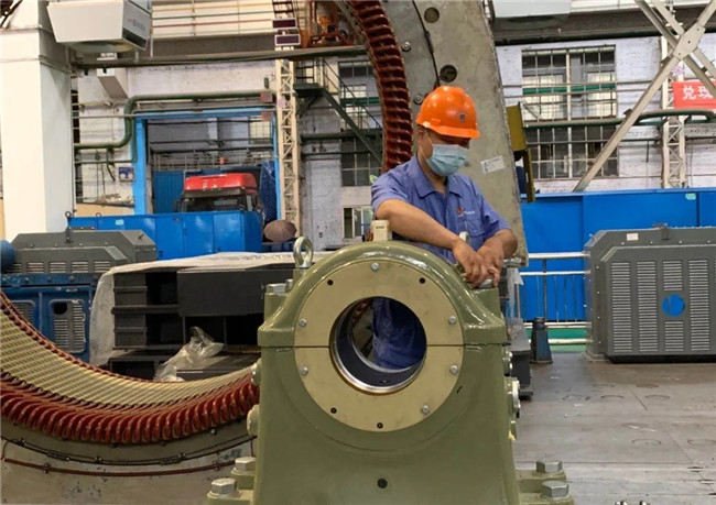 哈电集团动装公司电机制造部党员于海蛟正在进行中信重工轴承座拆装工序。