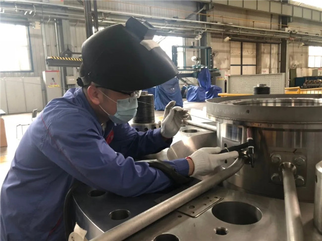 哈电集团动装公司核电制造部党员王向春正在焊接福清项目辅助系统管路。
