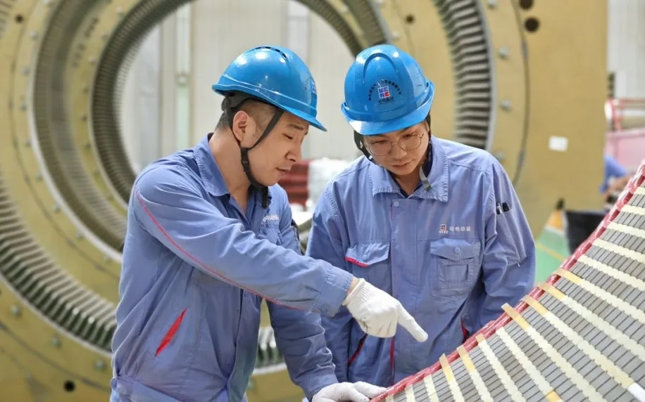 哈电集团动装公司下线工段人员正在对电机定子进行检查